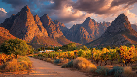 Majestic mountains frame a vineyard and dirt road at golden hour with painted skies