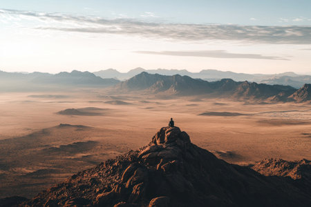 Photo of an expansive desert landscape with rolling hills, captured from above by a drone camera. In the foreground is a solitary figure sitting on top of a rock, overlooking vast mountains and endless plains, creating a sense of solitude and contemplation. The photo should have a muted color palette to emphasize the starkness against the dark rocks below, and the overall mood must convey a calm yet striking beauty. --ar 3:2 --v 6.1 Job ID: c649c763-a3f9-4f8b-83bc-303566274aa0