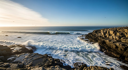 A dramatic coastal landscape at sunset rugged cliffs, rocky shores, and crashing ocean waves. Golden light illuminates the scene, highlighting the textures of the...