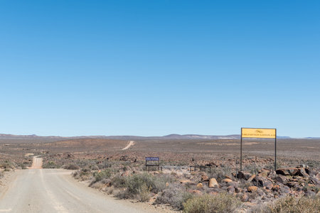 FRASERBURG, SOUTH AFRICA - SEP 3, 2022: Road landscape with name boards at Eselfontein Guest Farm on the historic Postal Route between Fraserburg and Sutherland in the Northern Cape Karoo