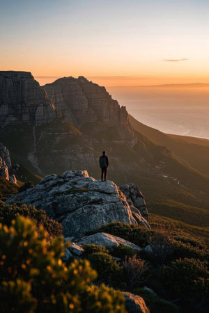 Free-spirited young teen sitting relaxing on boulder on top on luscious mountain watching sunset