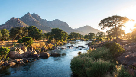 A beautiful landscape view of the Augrabies Falls Gorge, mountains and river in South Africa, taken at sunset with a sunburst on the horizon and rocks in the foreground.