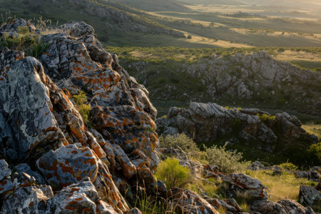 Explore a stunning Rocky landscape bathed in warm sunlight at sunset, showcasing unique rock formations, lush greenery, and serene desert flora.