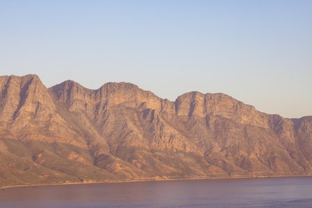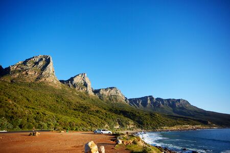 Coastline, beach and stones on the Atlantic coast. The concept of active, exotic and photo tourism. Fabulous port city Cape Town at the foot of Table Mountain