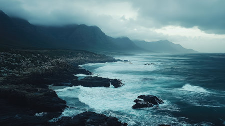 Stormy waves crashing on the rugged Cape Agulhas coast, ample copy space