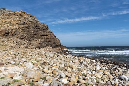 Cape of Good Hope, Western Cape, South Africa, Dec 2019. Large boulders cover the beach at the Cape of Good Hope facing the Atlantic Ocean