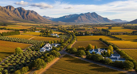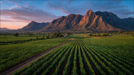A beautiful panorama captures a stunning vineyard landscape framed by majestic mountains during a soft sunset, showcasing rural tranquility.