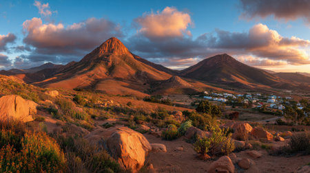 A beautiful sunset casts warm colors over rocky mountains, highlighting a serene village below. The landscape offers a tranquil escape into nature's untouched beauty.