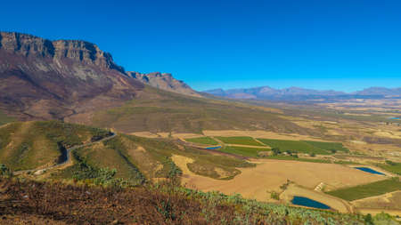 NUY VALLEY WORCESTER WESTERN CAPE SOUTH AFRICA - APRIL 2016 - Road taking a scenic route passing vineyards and farms of the Nuy Valley near Worcester in the Western Cape Southern Africa