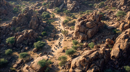 A wide shot of an endless desert with a single road winding across the horizon, creating beautiful curves in its path. The sky is clear and blue, adding to the vastness of the scene. In front of it stand two small trees, providing shade for people who have carried out their gear on dirt bikes or horses as they make their way through the landscape. A sense of solitude hangs over everything, highlighting the isolation that many long-haul travelers might feel while exploring such desolate landscapes. --ar 2:3 --v 6.1 Job ID: 152b3359-3ac4-42e8-9d44-c64203c4f0a4
