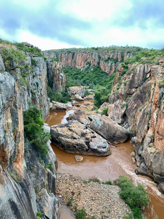 River canyon with sculpted rock walls and brown water – panoramic view of Bourke's Luck Potholes in Blyde River Canyon, South Africa