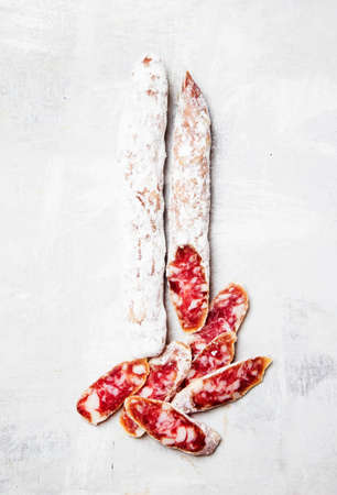 Traditional Spanish Fuet dried sausage on a light background. banner, menu, recipe place for text, top view.