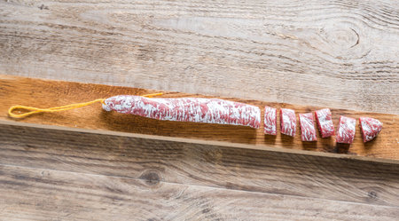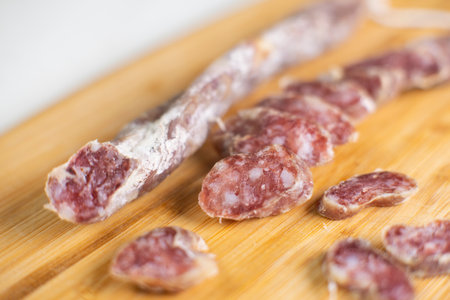 sliced dry sausage on a wooden board