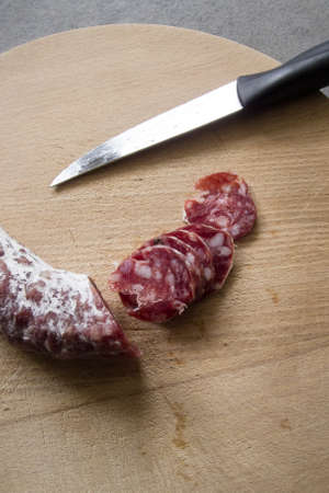 salami cut with a knife on a cutting board