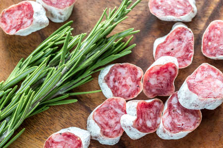 Slices of spanish salami on the wooden board