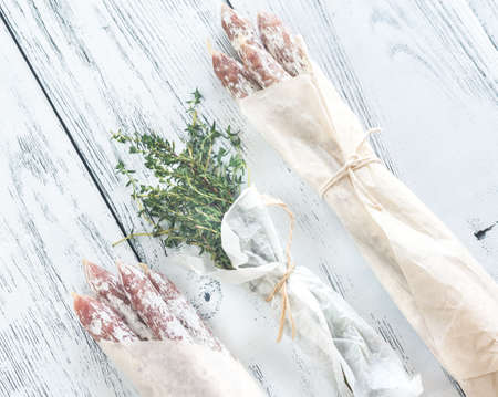 Fuet sausages in wrapping paper