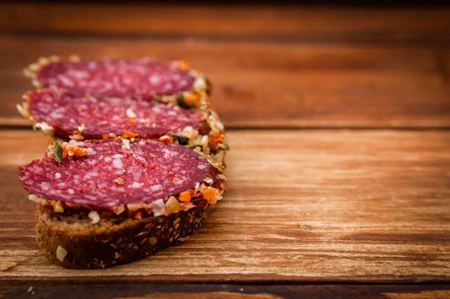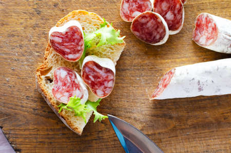 Sandwich with Catalan thin sausage with mold - fuet, on a wooden cutting board. horizontal orientation. top view.