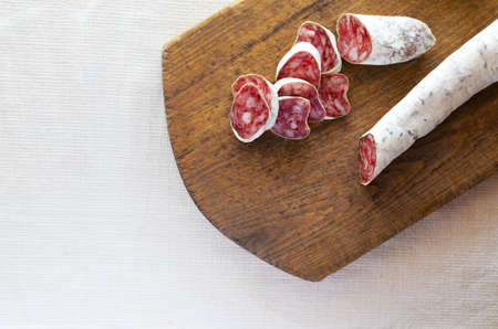Traditional Catalan thin sausage - fuet. Slices Pork sausage with mold on a wooden cutting board. The concept of traditional food. horizontal orientation. top view. copyspace.
