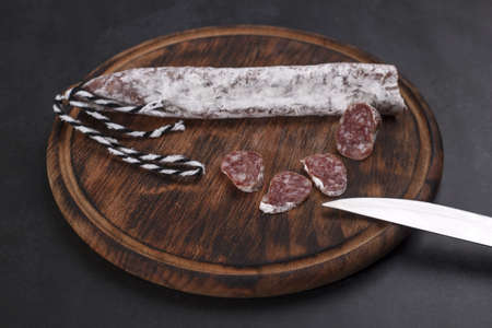 Traditional italian salami on dark background