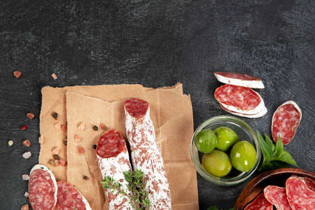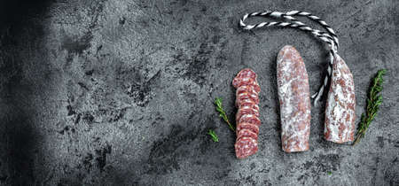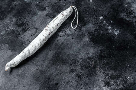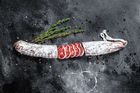 Spanish salami fuet sausage on a kitchen table. Black background. Top view. Copy space