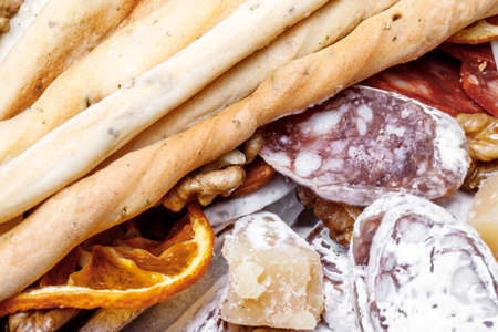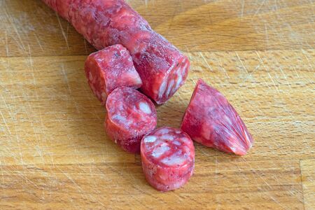 Traditional sausage, moldy. Sliced salami sausage sausage, orange, cheese . Close-up. Horizontal photo.