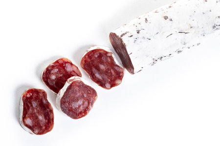Sliced cuts of longaniza, dry cured spanish sausage on white surface with copy space.