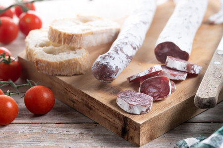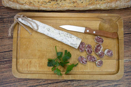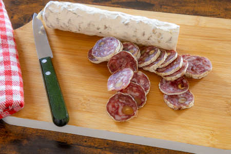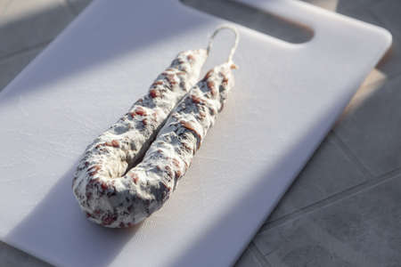 French cured sausage with white mold on cutting board