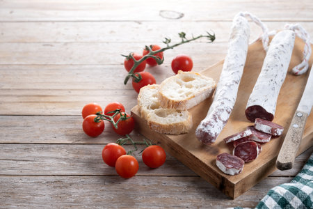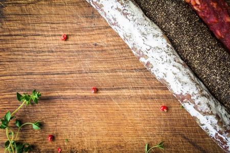 sausage fuet smoked dried dried salami meat on the table breakfast breakfast outdoor top view food background rustic image