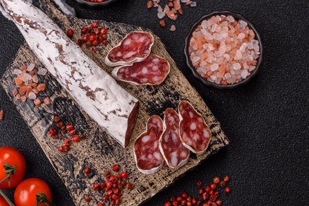 Delicious Spanish smoked sausage fuet with salt and spices on a dark concrete background