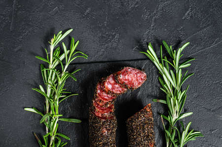 Fuet sausage cut in slices on a black slate plate with rosemary. Black background. Top view.