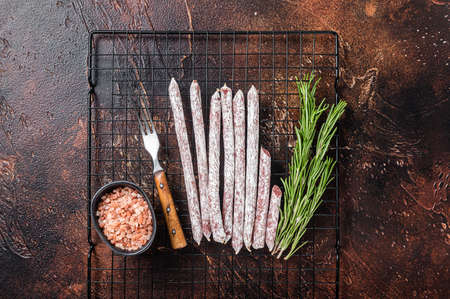 Fuet Catalan dry sausages with rosemary. Dark background. Top view
