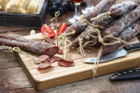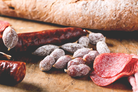 Variety of french dried sausages from Auvergne on the wooden table