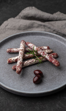 Close-up of Spanish mini fuet on the grey plate