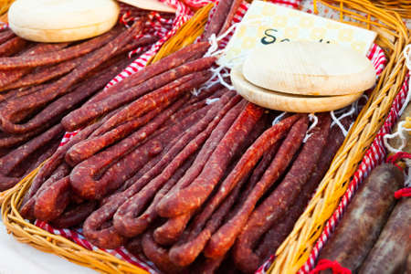 Farm sausage on butcher market