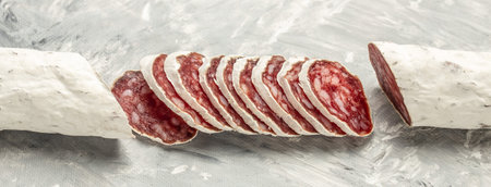 Dry Spanish salami sausage fuet as a snack for the dinner table. Fuet sausage as a food background for your design