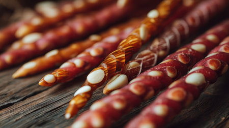 A captivating close-up of colorful decorative sticks featuring unique patterns arranged beautifully on a rustic wooden surface. Ideal for art or craft projects.
