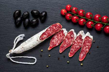 Slices of fuet catalan thin sausage, black olives and cherry tomatoes on the vine over black slate surface. Traditional spanish dry-cured pork salami with white mold and vegetables. Tasty meat delicacy. Top view.