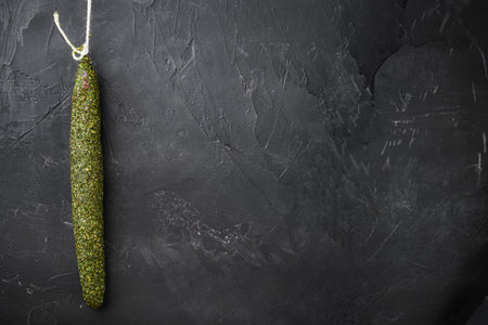 Dry salami sausage fuet in herbs on black background with space for text.