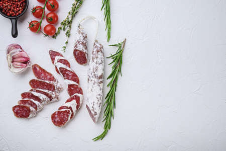 Dry cured fuet salami sausage slices with herbs on white surface, top view with copy space.