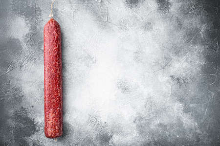 Traditional Spanish fuet on gray background. Dry cured pork sausages with a peculiar taste. Flat lay, top view, copy space