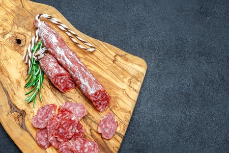 Sliced dry smoked salami sausage on slate board