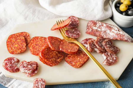 Board with slices of salami on light background