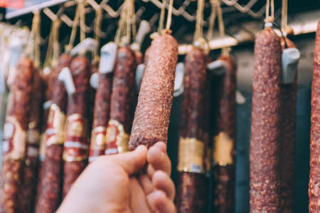 Catalan dry sausages called fuet at Mercat de Sant Josep de la Boqueria market in Barcelona