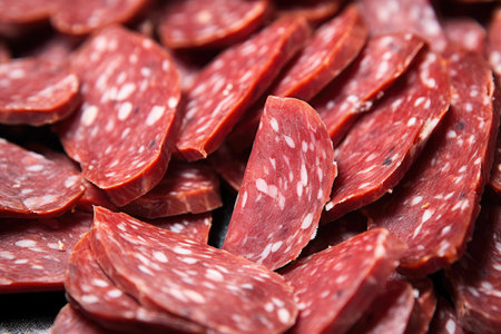 Freshly sliced salami stacked on a clean surface showcasing rich color and texture in a well-lit setting