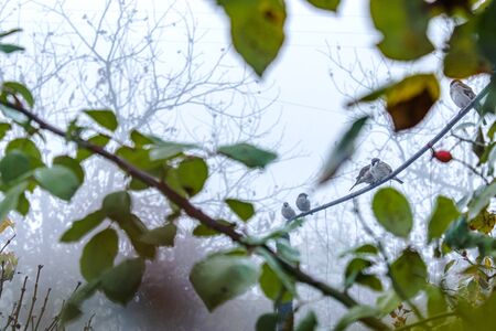 Little sparrows are sitting among the yellow and green leaves in the fog. Close-up.
