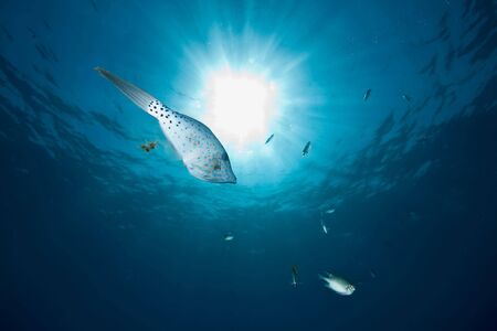 Close up of a blowfish swimming in the clear ocean. Natural background with beautiful lighting