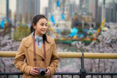 Asian traveller girl travel in seoul city with her digital camera, South Korea.