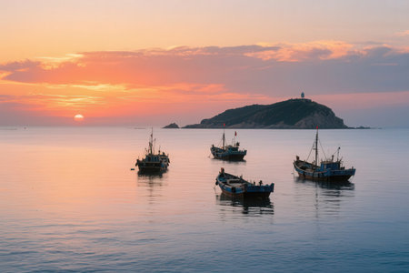 Fishing boats in the sea with a beautiful sunset in the background