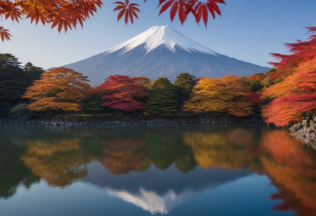 Scenic view of Mount Fuji mirrored in calm lake, surrounded by colorful autumn trees