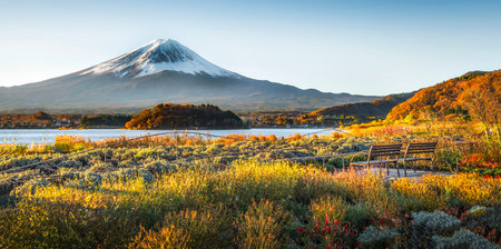 Panorama of Kawaguchiko on a Sunny autumn day. Bench with a view of mount Fuji. Lake Kawaguchiko and mount Fuji. Natural attractions in Japan. Vacation in Japan.